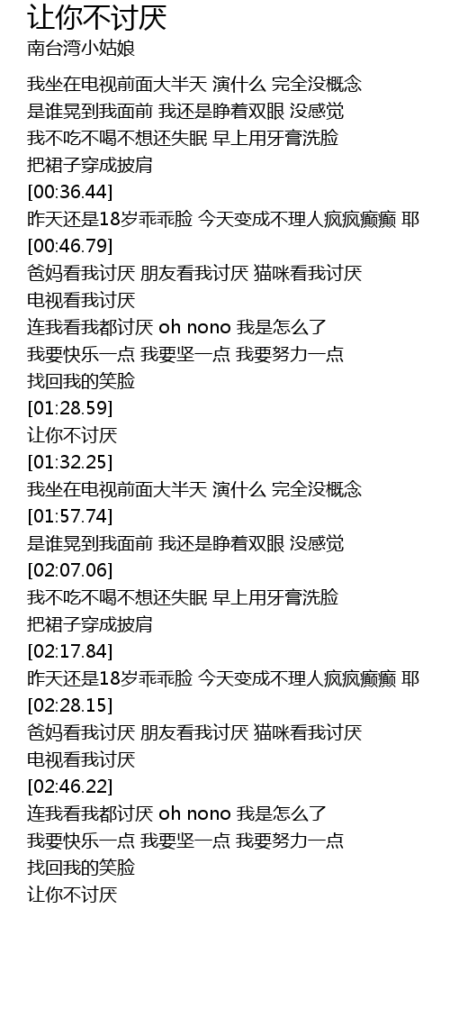 | [02:37.81] | 爸妈看我讨厌 朋友看我讨厌 猫咪看我讨厌 电视看我讨厌 |