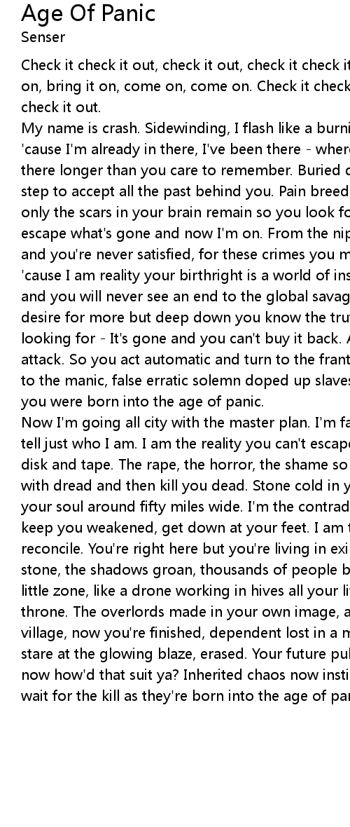 My name is crash. Sidewinding, I flash like a burning flare - don't look away 'cause I'm already in there, I've been there - wherever you stare. I've been there longer than you care to remember. Buried deep inside you, now you must step to accept all the past behind you. Pain breeding pain and it's back again, only the scars in your brain remain so you look for a vent, you consent to escape what's gone and now I'm on. From the nipple to the needle to the bottle and you're never satisfied, for these crimes you must be tried. You can't hide 'cause I am reality your birthright is a world of insanity. Disconnected legacy and you will never see an end to the global savagery. Continuing to feed your desire for more but deep down you know the truth you'll never find what you're looking for - It's gone and you can't buy it back. And now your senses are under attack. So you act automatic and turn to the frantic nation of addicts. Reduced to the manic, false erratic solemn doped up slaves and servants of greed because you were born into the age of panic. |