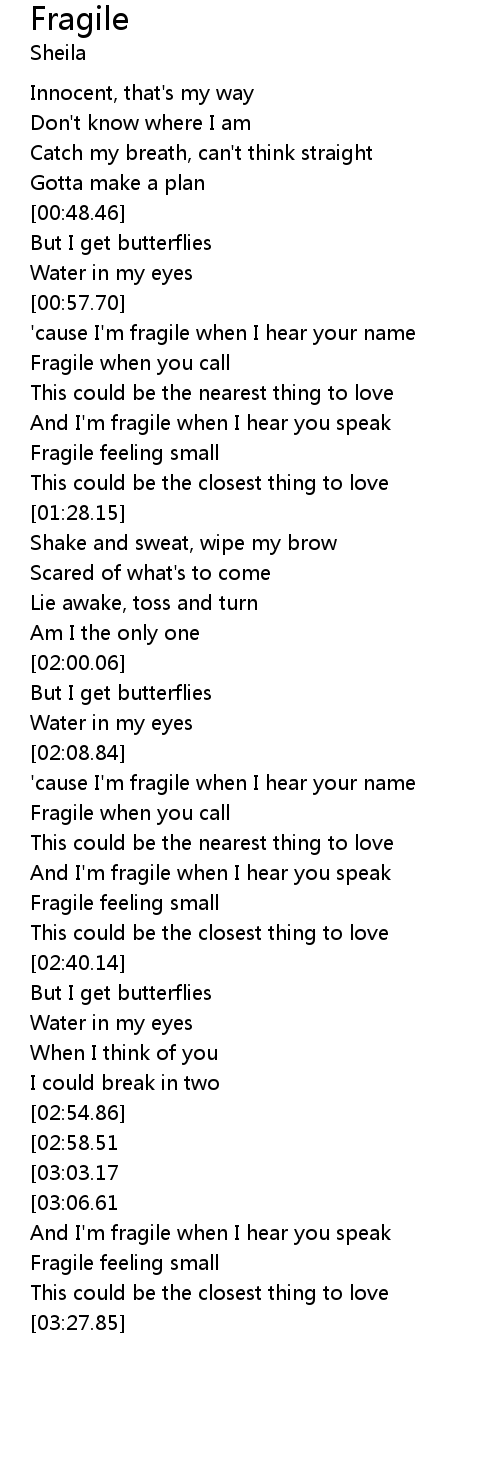 | [03:29.38][02:58.51] | 'cause I'm fragile when I hear your name |