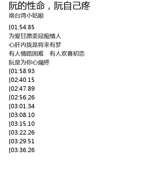 | [00:03.00][01:54.85][03:39.26][04:21.00] | 阮的性命阮家己疼 |