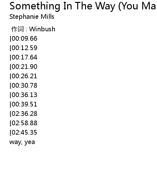 | [03:03.31][02:45.35][02:27.50][02:09.44][01:12.50][00:54.57] | Something in the way, yea |