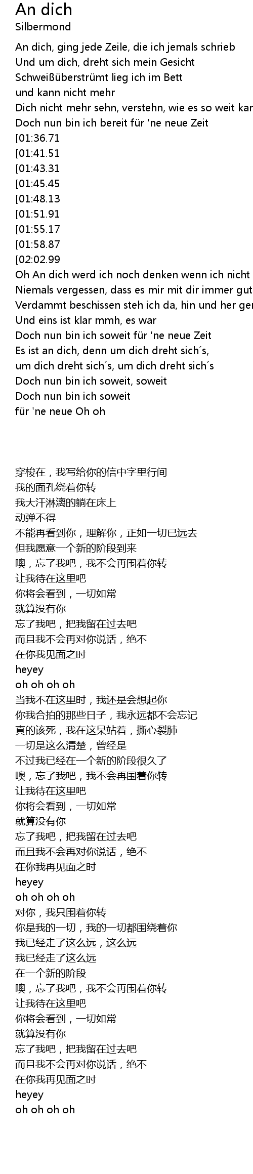 | [02:31.49][01:36.71][00:37.41] | Oh, Vergiss mich, dreh dich nicht um |