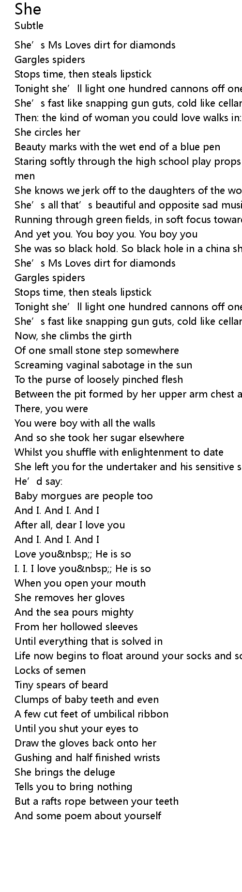 | She’s fast like snapping gun guts, cold like cellar's bare foot | |
