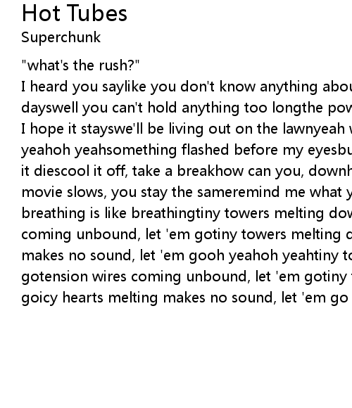 I hope it stayswe'll be living out on the lawnyeah we're back where we belongoh yeahoh yeahsomething flashed before my eyesbut slow, like a hot tube glowing as it diescool it off, take a breakhow can you, downhill speeding on a bike?the movie slows, you stay the sameremind me what your breathing is likeyour breathing is like breathingtiny towers melting down, let 'em gotension wires coming unbound, let 'em gotiny towers melting down, let 'em goicy hearts melting makes no sound, let 'em gooh yeahoh yeahtiny towers melting down, let 'em gotension wires coming unbound, let 'em gotiny towers melting down, let 'em goicy hearts melting makes no sound, let 'em go |