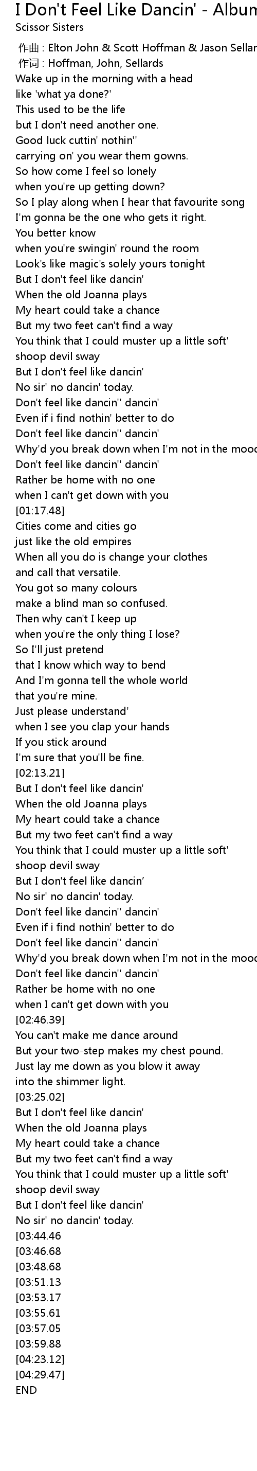 | [04:02.09][03:44.46] | Don' t feel like dancin'' dancin' |