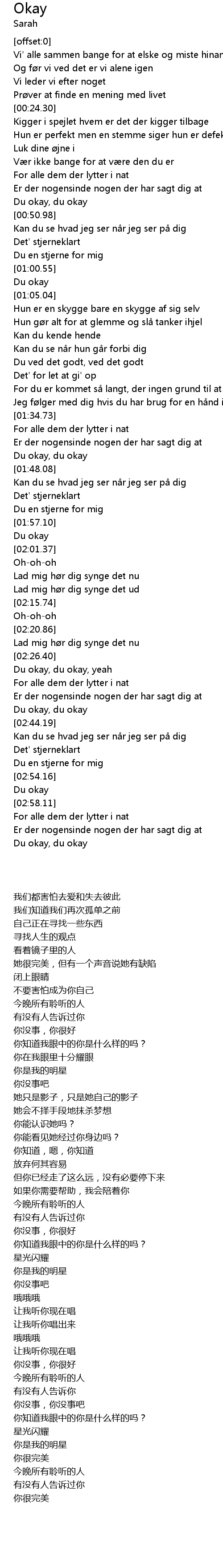 | [01:28.62] | Jeg f lger med dig hvis du har brug for en h nd i m rket |