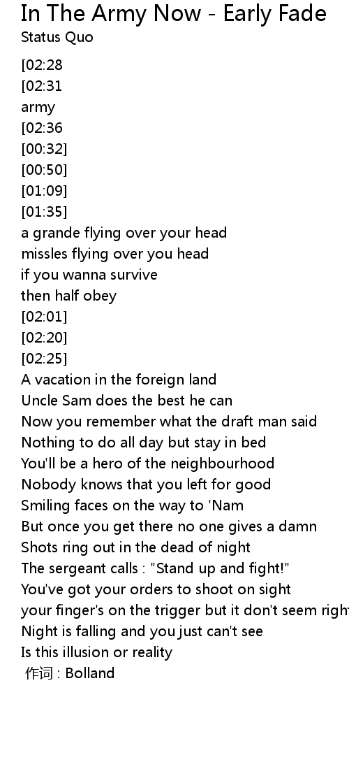 | [02:41][02:31][02:13][01:55][01:20][01:02][00:44][00:25] | Oh, oh you're in the army |