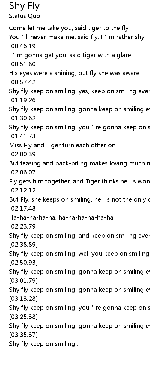 | [02:40.38] | Shy fly keep on smiling, well you keep on smiling every day |