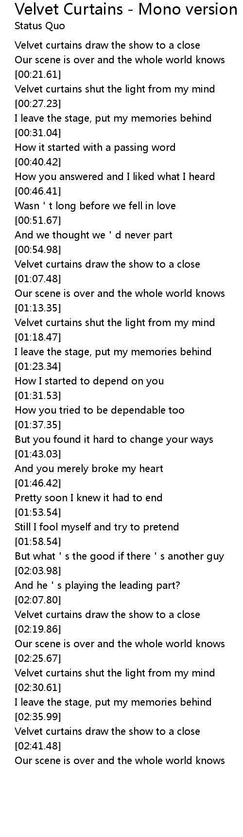 | [00:24.04] | Velvet curtains shut the light from my mind |