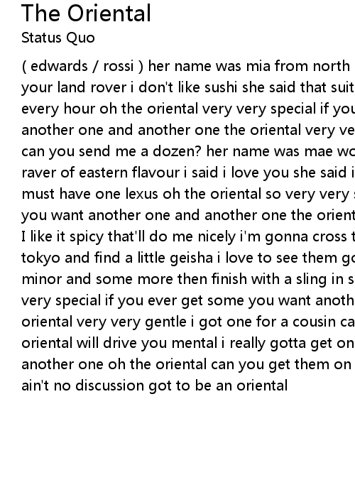| ( edwards / rossi ) her name was mia from north korea i said come over bring your land rover i don't like sushi she said that suits me i take a shower on every hour oh the oriental very very special if you ever get some you want another one and another one the oriental very very gentle i got one for a cousin can you send me a dozen? her name was mae wong she came from hong kong she was a raver of eastern flavour i said i love you she said i'd love to go down to texas must have one lexus oh the oriental so very very special if you ever get some you want another one and another one the oriental very very gentle | |