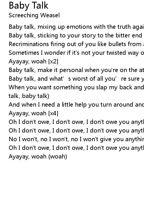 | When you want something you slap my back and smile baby talk Baby talk, baby talk, baby talk | |