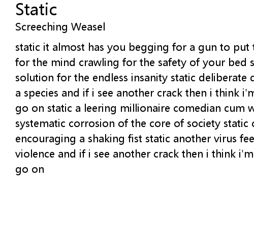 static it almost has you begging for a gun to put to your head static cryogenics for the mind crawling for the safety of your bed static another strip mall solution for the endless insanity static deliberate de-evolution of the soul of a species and if i see another crack then i think i'm gonna crack 'cause i can't go on static a leering millionaire comedian cum working man on tv static a systematic corrosion of the core of society static cartoon voices on the radio encouraging a shaking fist static another virus feeding off teh frenzied orgy of violence and if i see another crack then i think i'm gonna crack 'cause i can't go on |