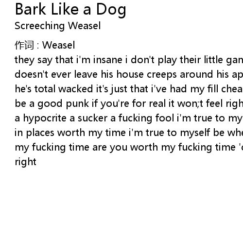 | they say that i'm insane i don't play their little games the crazy weasel doesn't ever leave his house creeps around his apartment watches tv on the couch he's total wacked it's just that i've had my fill cheap easy answers kill try to be a good punk if you're for real it won;t feel right you'll end up feeling like a hypocrite a sucker a fucking fool i'm true to myself go where i want hang out in places worth my time i'm true to myself be where i want love the people worth my fucking time are you worth my fucking time 'cause i'm all right yeah i'm all right |