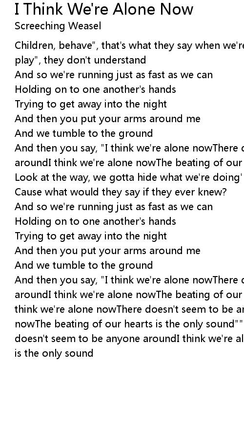 And then you say, "I think we're alone nowThere doesn't seem to be anyone aroundI think we're alone nowThe beating of our hearts is the only sound""I think we're alone nowThere doesn't seem to be anyone aroundI think we're alone nowThe beating of our hearts is the only sound""I think we're alone nowThere doesn't seem to be anyone aroundI think we're alone nowThe beating of our hearts is the only sound |