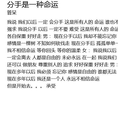 | wo shuo wo men yi hou yi ding hui fen shou zhe shi suo you ren de ming yun shui ye bu neng qu qiang qiu wo shuo fen shou yi hou yi ding bu yao nan shou zhe shi suo you ren de ming yun ge zi bao zhong hao hao zou nan: xian zai fen shou yi hou wo que bu neng wang ji ni gan qing shi yi ke shu bu zhi ru he kan fa zou xian zai fen shou hou gu gu dan dan yi ge ren wo bu xiang xin ming yun deng ni hui tou deng ni de wen rou nv: wo shuo wo yi hou yi ding hui li qu ren dou shi zi you de wei bi yong yuan zai yi qi wo shuo wo men yi hou hai ke yi zuo peng you zun zhong bie ren de zhui qiu hao hao bao zhong hao hao zou nan: xian zai duo nian yi hou wo bi xu wang ji ni gan qing shi zi you de shui dou wu fa qu qiang qiu xian zai duo nian yi hou wo hai shi yi ge ren yong yuan bu xiang xin ming yun dan shi kai shi qu... cheng shou |