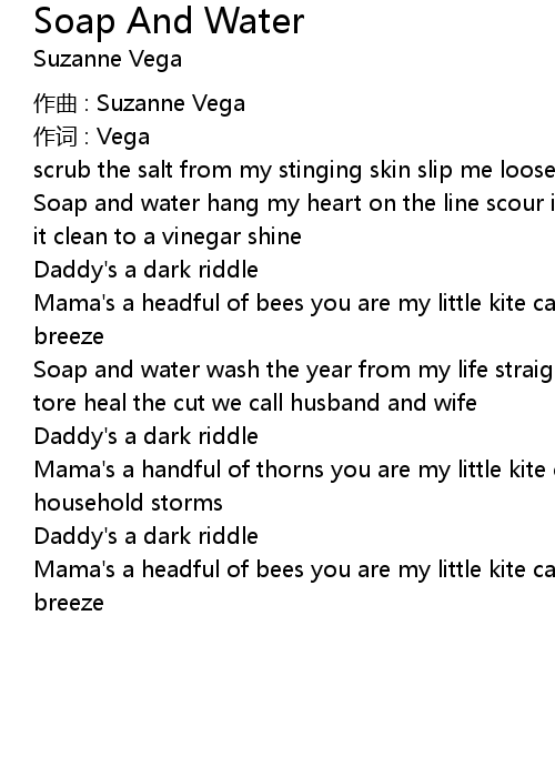 | Soap and water wash the year from my life straighten all that we trampled and tore heal the cut we call husband and wife | |