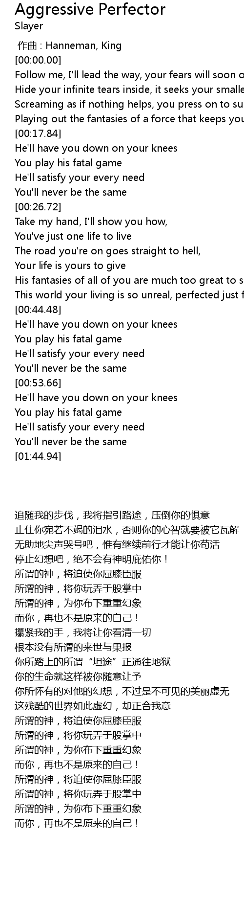 | [00:09.25] | Follow me, I'll lead the way, your fears will soon overtake |
