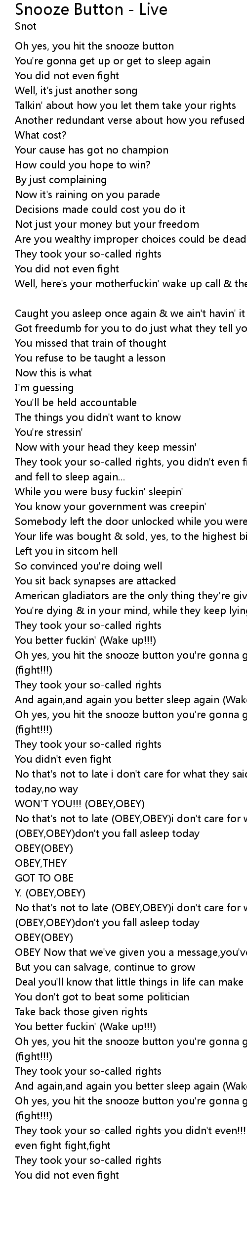 | No that's not to late (OBEY,OBEY)i don't care for what they said (OBEY,OBEY)don't you fall asleep today | |