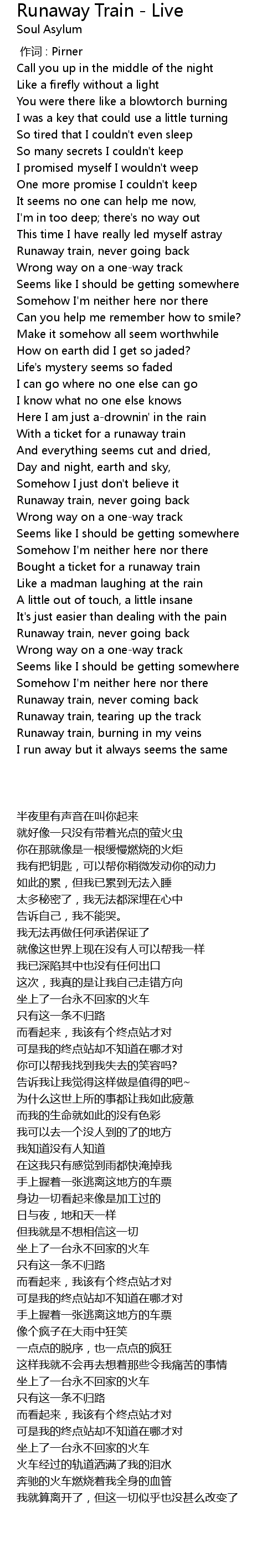 | [03:29.350] | Runaway train, never coming back |