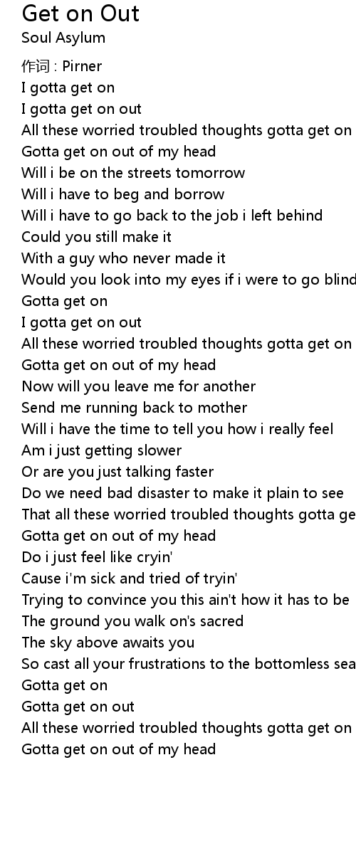| All these worried troubled thoughts gotta get on out of my head | |