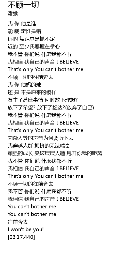 | [02:48.810] | wǒ bù guǎn nǐ men shuō shén mó wǒ dōu bù tīng |
