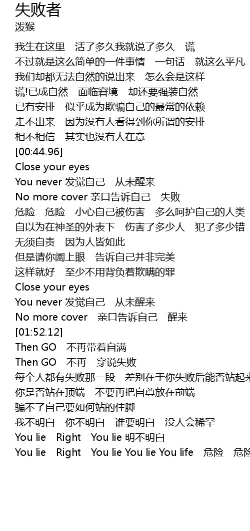| [00:53.88] | No more cover qīn kǒu gào sù zì jǐ shī bài |