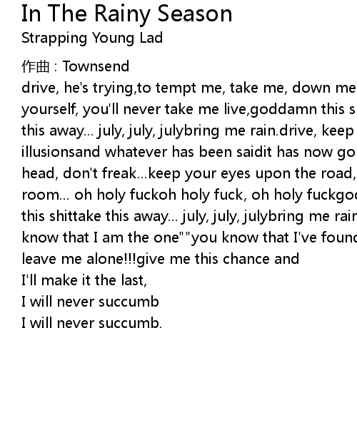 | drive, he' s trying, to tempt me, take me, down me, rape me, fuck her... fuck yourself, you' ll never take me live, goddamn this sun, go, he' s not the onetake this away... july, july, julybring me rain. drive, keep calm, these are only just illusionsand whatever has been saidit has now gone completely wrongbut keep your head, don' t freak... keep your eyes upon the road, and just don' t think about that room... oh holy fuckoh holy fuck, oh holy fuckgoddamn this heatchrist, goddamn this shittake this away... july, july, julybring me rainhe said " I know that you know that I am the one"" you know that I' ve found a way..." don' t die on me, don' t leave me alone!!! give me this chance and | |