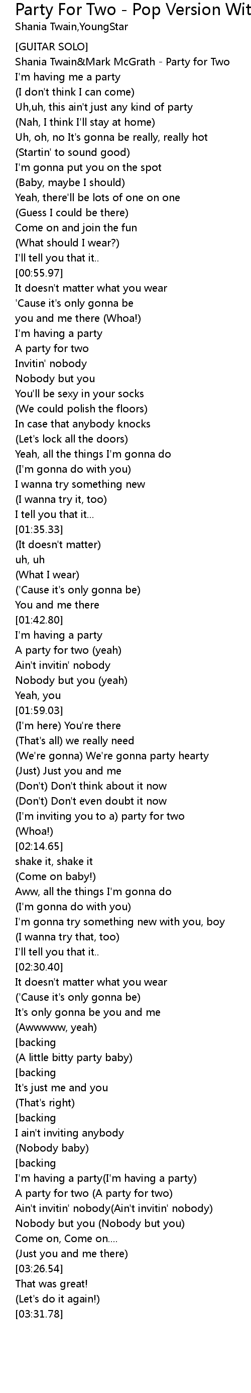 [00:00.00] Shania Twain&Mark McGrath - Party for Two
