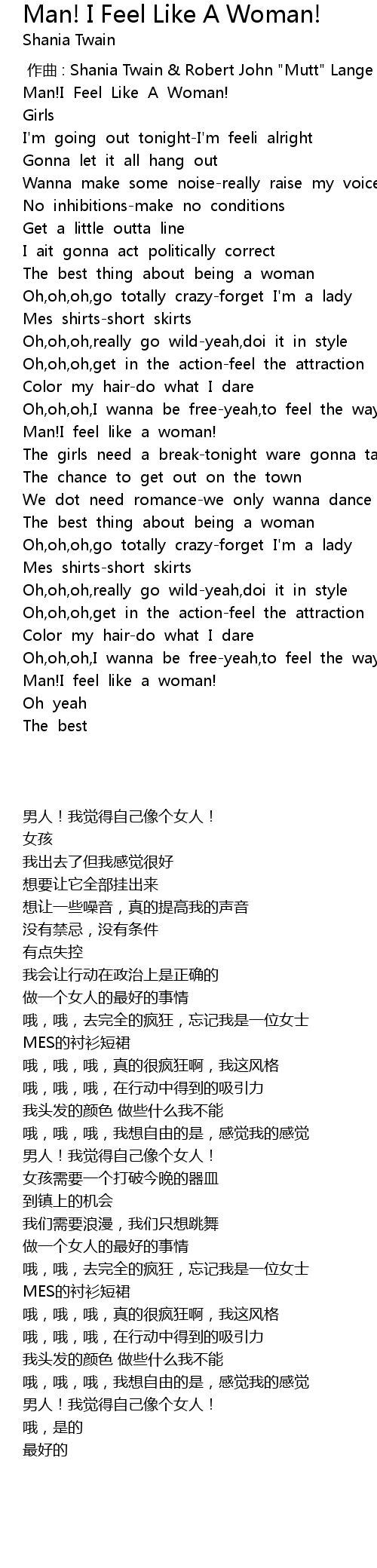 | [00:02.60] | Man! I Feel Like A Woman! |