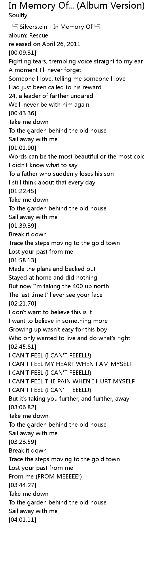 | [00:00.00] | ≡卐 Silverstein - In Memory Of 卐≡ |