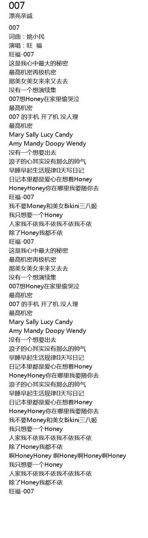 | [00:21.00] | 007想Honey在家里偷哭泣 |