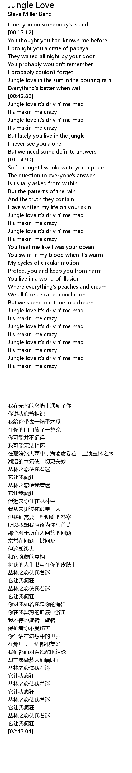 | [02:35.13] | Jungle love it' s drivin' me mad |