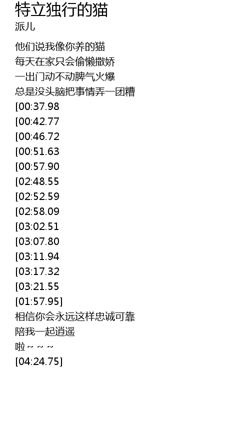 | [03:55.30][03:17.32][01:48.69] | 我就是特立独行的猫 |