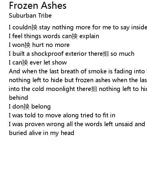 | And when the last breath of smoke is fading into the cold moonlight there抯 nothing left to hide but frozen ashes when the last breath of smoke is fading into the cold moonlight there抯 nothing left to hide it抯 time to leave it all behind | |