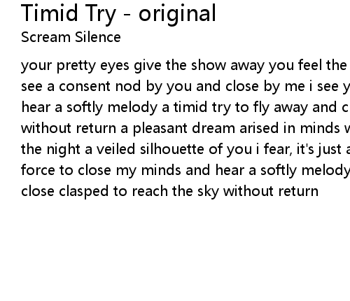 your pretty eyes give the show away you feel the want of be beloved i wait and see a consent nod by you and close by me i see your promising winged eyes and hear a softly melody a timid try to fly away and close clasped to reach the sky without return a pleasant dream arised in minds woken up by confusion and past the night a veiled silhouette of you i fear, it's just a second dream i feel force to close my minds and hear a softly melody a timid try to fly away and close clasped to reach the sky without return |
