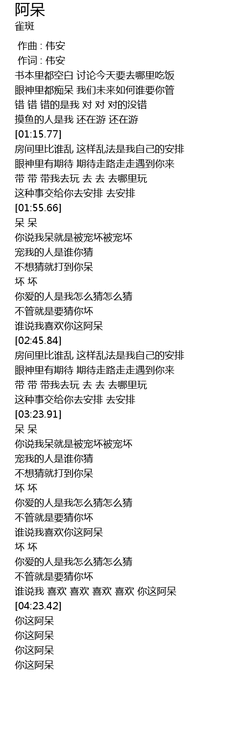 | [04:09.74] | 谁说我 喜欢 喜欢 喜欢 喜欢 你这阿呆 |