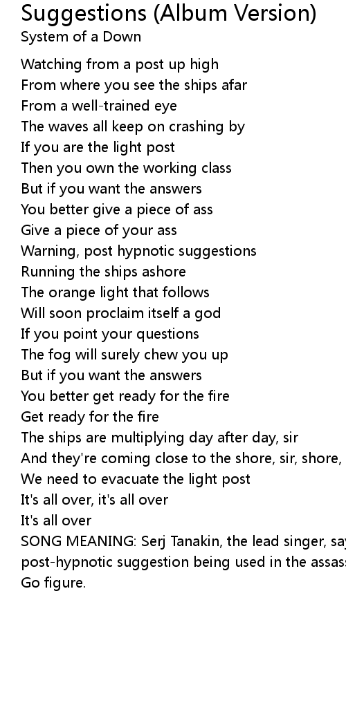 SONG MEANING: Serj Tanakin, the lead singer, says this song is about post-hypnotic suggestion being used in the assassination of President Kennedy. Go figure. |
