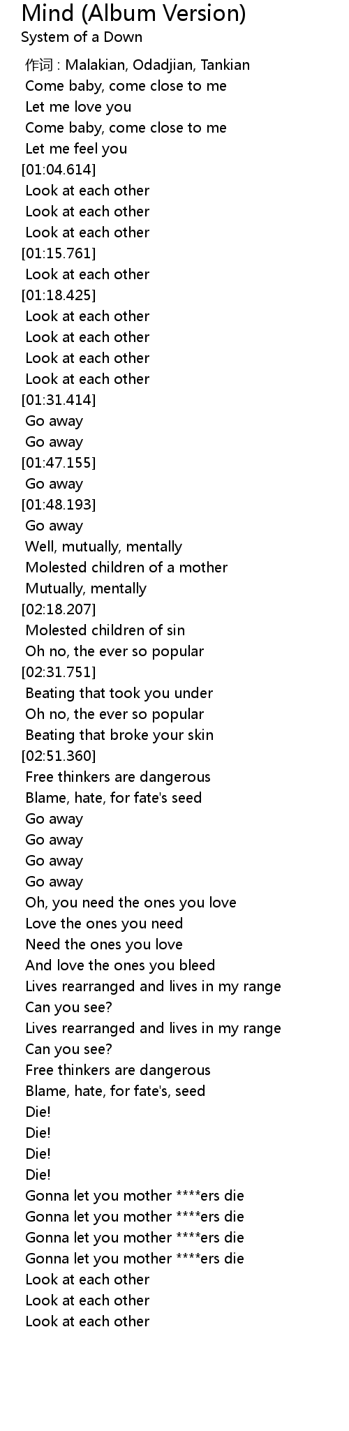 | [00:00.000] | 作词 : Malakian, Odadjian, Tankian |