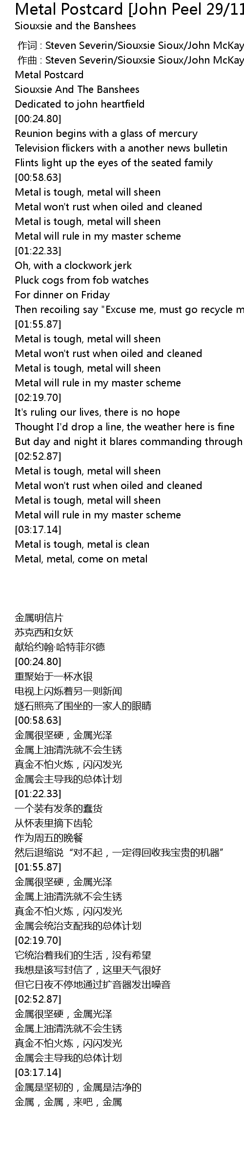 | [00:00.033] | zuo qu : Steven Severin Siouxsie Sioux John McKay Kenny Morris |