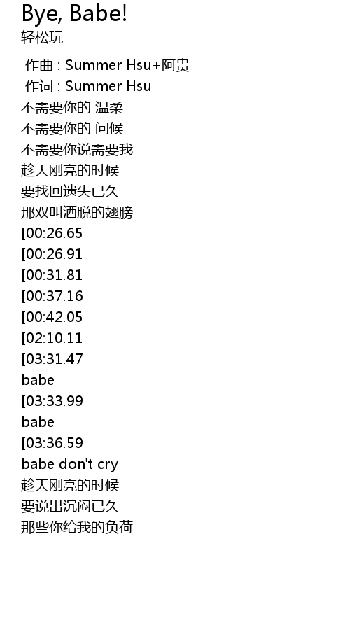 | [03:47.02][03:36.59][03:27.43][03:17.14][02:26.56][02:16.22][01:03.08][00:53.09] | byebye babe don't cry |