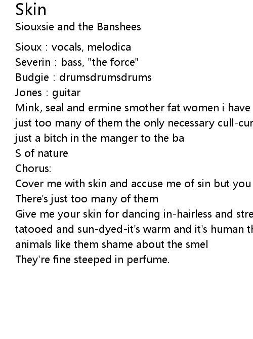 | Give me your skin for dancing in-hairless and streamline-fits like my own skin tatooed and sun-dyed-it's warm and it's human there was too many of them-the animals like them shame about the smel | |