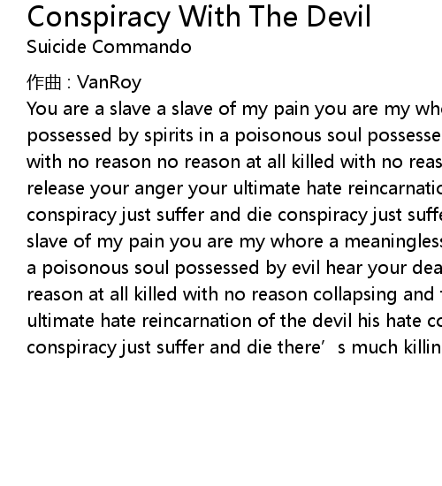 | You are a slave a slave of my pain you are my whore a meaningless asshole possessed by spirits in a poisonous soul possessed by evil your dead call killed with no reason no reason at all killed with no reason collapsing and fall release your anger your ultimate hate reincarnation of the devil his hate conspiracy just suffer and die conspiracy just suffer and die you are a slave a slave of my pain you are my whore a meaningless asshole possessed by spirits in a poisonous soul possessed by evil hear your dead call killed with no reason no reason at all killed with no reason collapsing and fall release your anger your ultimate hate reincarnation of the devil his hate conspiracy just suffer and die conspiracy just suffer and die there' s much killing to be done to b |