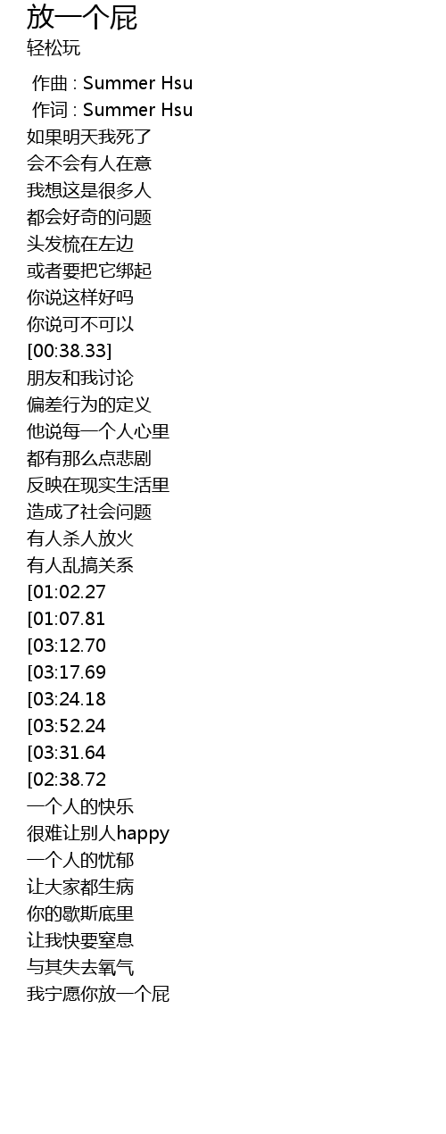 | [03:33.32][03:12.70][02:11.95][01:14.38] | 就放个屁 大快人心 |