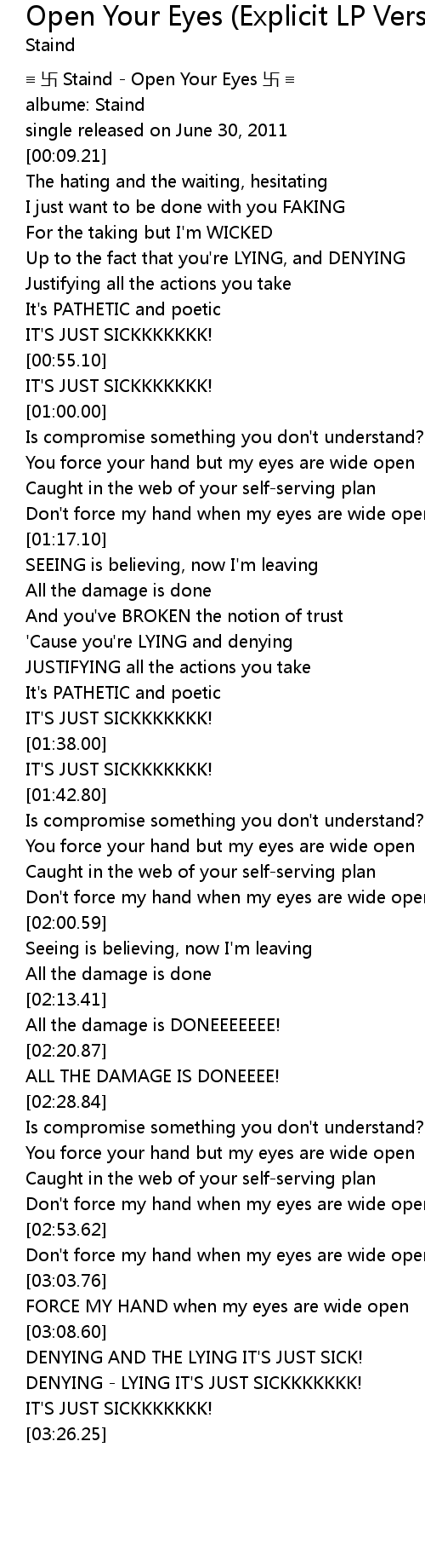 | [00:00.00] | ≡ 卐 Staind - Open Your Eyes 卐 ≡ |