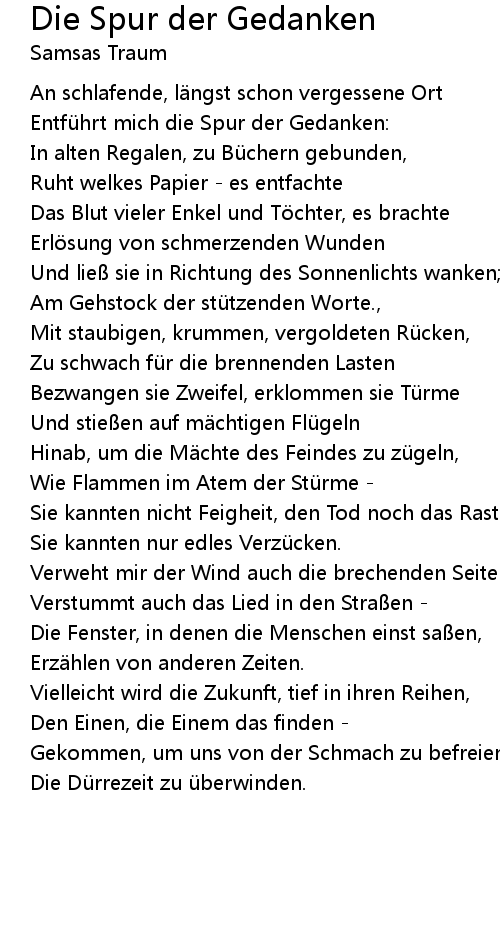| Verweht mir der Wind auch die brechenden Seiten, | |