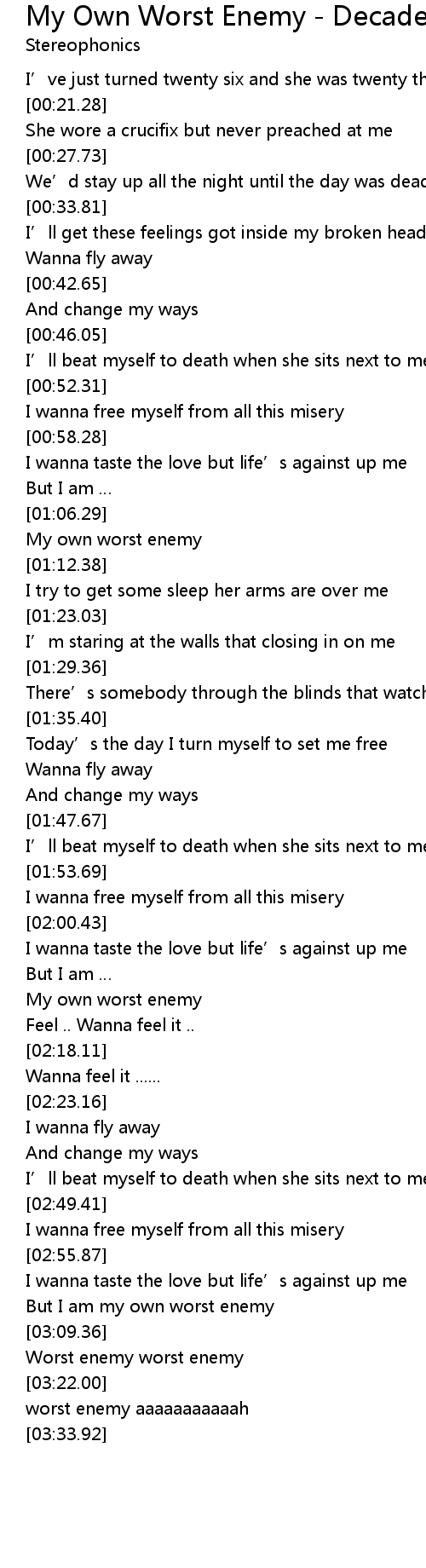 | Song | My Own Worst Enemy - Decade In The Sun Version |