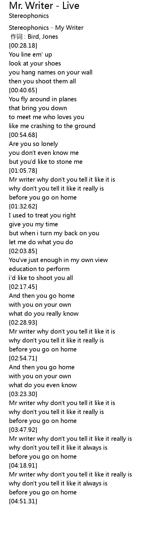 | [02:30.17] | Mr writer why don' t you tell it like it is |