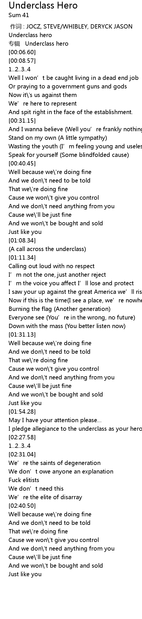 | [01:57.71] | I pledge allegiance to the underclass as your hero at large. |