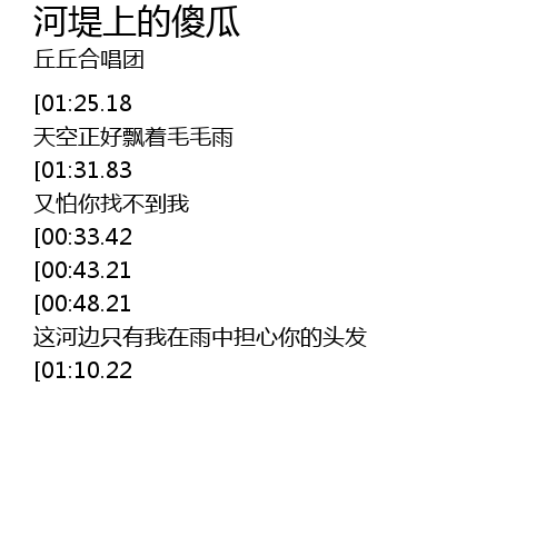 | [02:01.95][01:25.18][00:56.82][00:20.03] | 我在长堤上等着你 天空正好飘着毛毛雨 |