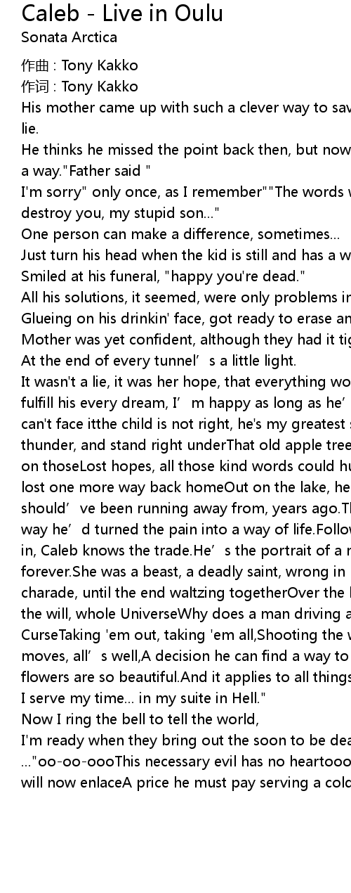 | It wasn' t a lie, it was her hope, that everything would be fine one day" He can fulfill his every dream, I' m happy as long as he' s not."" I hate it and fear can' t face itthe child is not right, he' s my greatest shameGo out, create thunder, and stand right underThat old apple treeWhere dead snakes let him feed on thoseLost hopes, all those kind words could hurt him even more, nowSomehow, lost one more way back homeOut on the lake, he rows towards a monster he should' ve been running away from, years ago. The past had made him blind to the way he' d turned the pain into a way of life. Followed his father, tucked him in, Caleb knows the trade. He' s the portrait of a man his mother drew to hate forever. She was a beast, a deadly saint, wrong in many waysWanted to keep up the charade, until the end waltzing togetherOver the hills, under the sea, Fighting the will, whole UniverseWhy does a man driving a hearseLive in fear, Gift and a CurseTaking ' em out, taking ' em all, Shooting the wall, over and outWhen nothing moves, all' s well, A decision he can find a way to live with... and dried up flowers are so beautiful. And it applies to all things living, and dead. For that I serve my time... in my suite in Hell." | |
